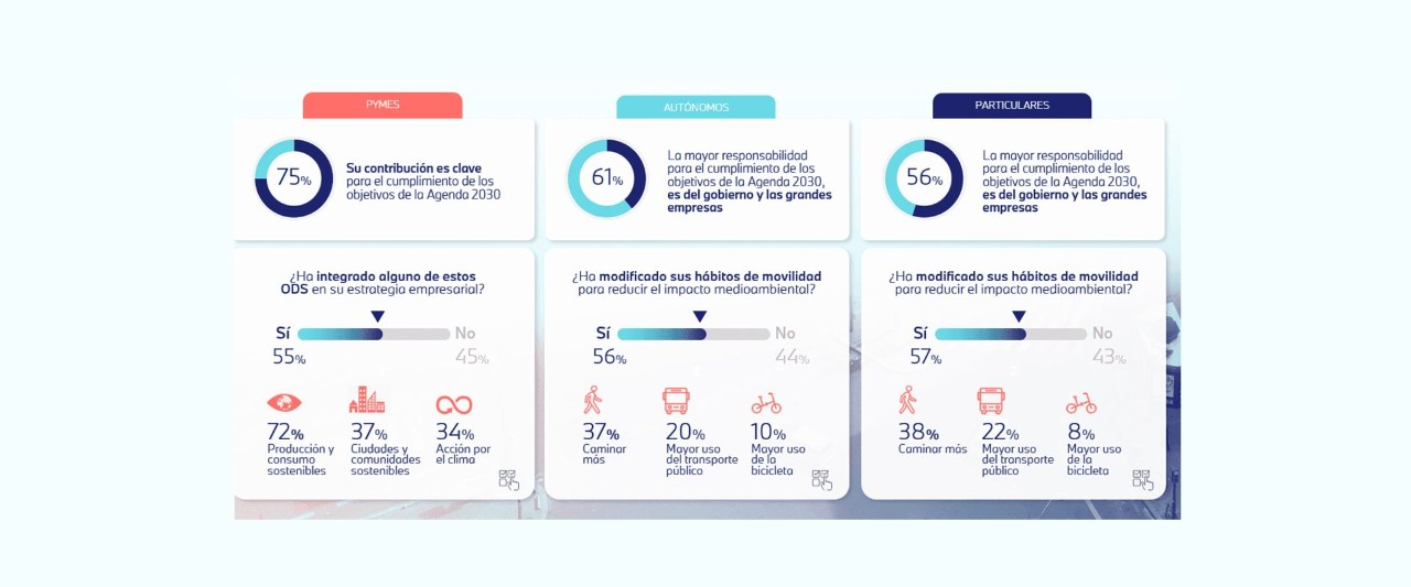 En cuanto a si han realizado algún cambio en sus hábitos para reducir el impacto medioambiental o si han integrado algún ODS en su estrategia empresarial, no se observan diferencias notables en cuanto a los colectivos consultados, y en todos los casos se sitúan en torno al 55%. Sin embargo, sí se aprecian cambios significativos en cuanto a su opinión sobre quién tiene la mayor responsabilidad para alcanzar la consecución de los objetivos de la Agenda 2030. Así, mientras el 75% de las pymes considera que su papel es esencial para este fin, los autónomos y particulares opinan que esta responsabilidad corresponde en mayor medida al gobierno y a las grandes empresas (61% y 56% respectivamente).
