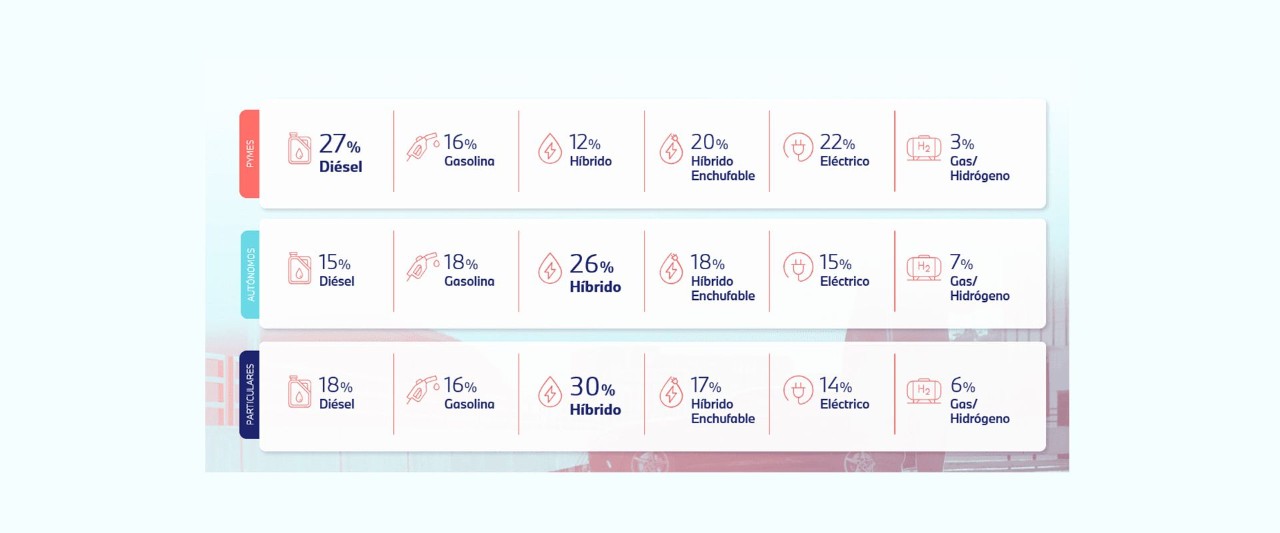 Aunque las alternativas de transporte disponibles para los ciudadanos son cada vez más diversas, el vehículo sigue siendo la opción más elegida como alternativa de movilidad, observándose una transición gradual hacia los vehículos electrificados ante una futura intención de compra, y siendo las pymes el colectivo más orientado a esta opción de movilidad. A pesar de ello, la primera alternativa de las pymes sigue siendo el diésel (27%), seguido del eléctrico (22%). En el caso de particulares y autónomos el híbrido se declara primera opción (30% y 26%, respectivamente).